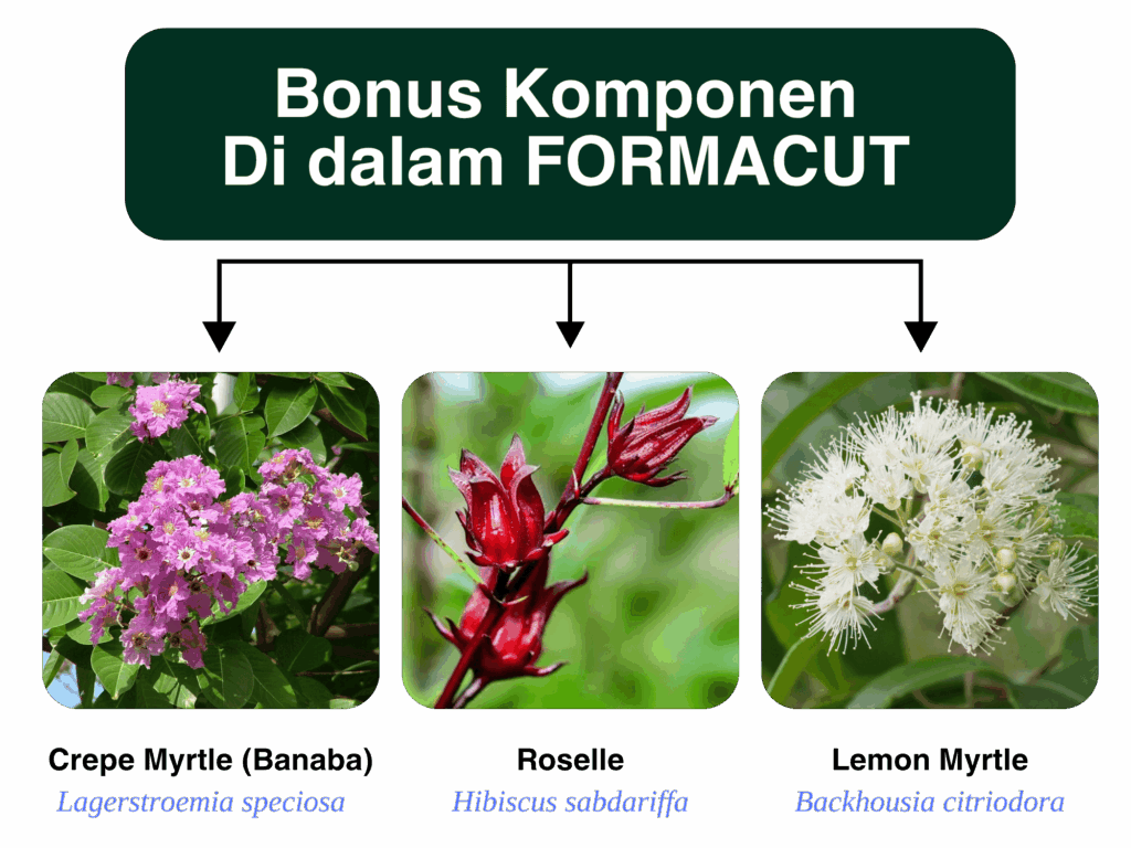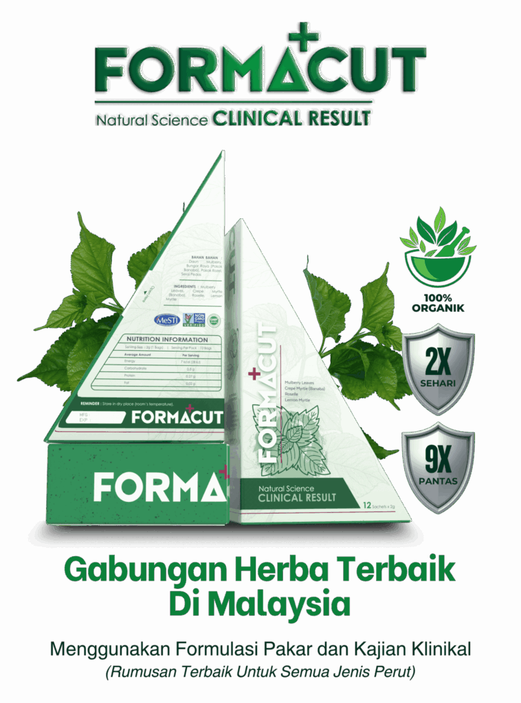 FORMACUT mengandungi Daun Mulberry berfungsi dengan block gula berlebihan daripada diserap dalam badan. Bila gula terkawal, proses pembakaran lemak jadi lebih pantas, selera makan lebih terkawal dan mengurangkan lebihan air terkumpul (gemuk air) dengan cara lancarkan pembuangan.