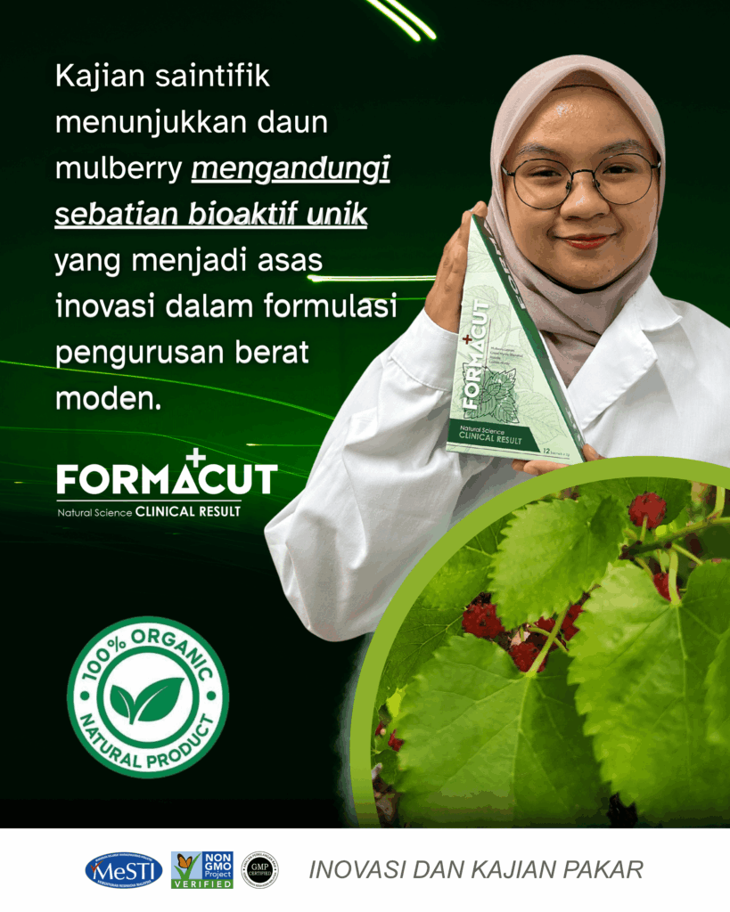 “Terbukti secara saintifik, Formacut dengan daun Mulberry bantu kawal gula darah, percepat metabolisme lemak, dan sokong penurunan berat badan secara semula jadi, selamat, dan efektif.” - Dr. Nurshahirah