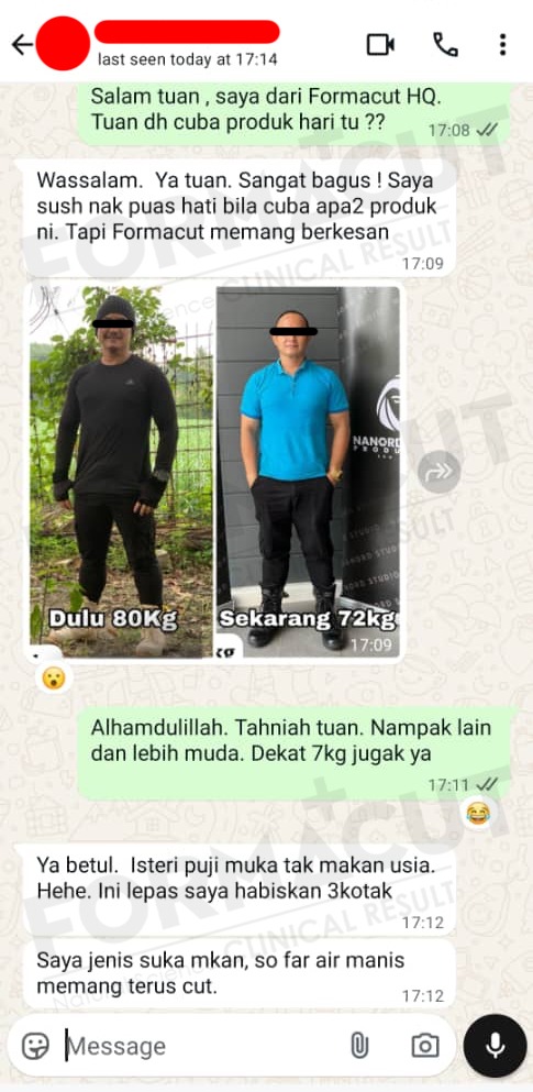 “Dulu saya struggle dengan perut buncit dan berat 80kg. Selepas pakai Formacut secara konsisten, kini 74kg, perut kempis, dan orang sekeliling mula perasan perubahan ketara!” - En. Azman