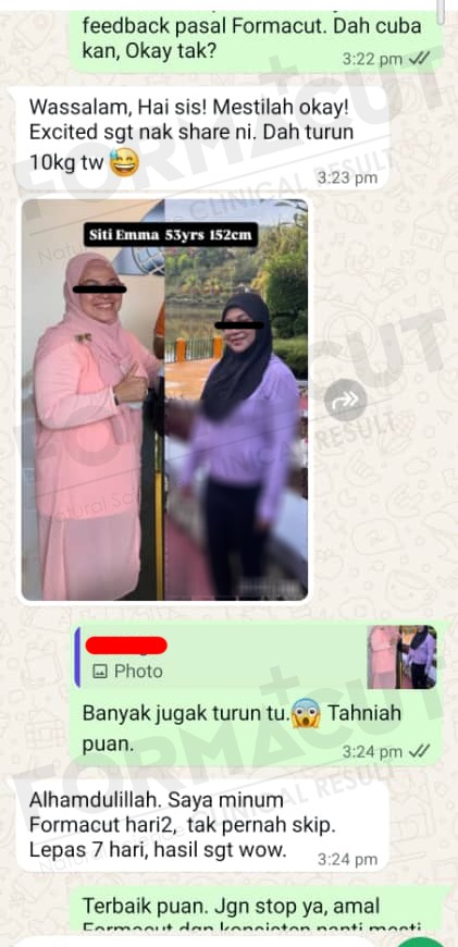“Berat turun 10kg! Dulu susah tahan nafsu makan, terutama bila nampak makanan manis. Selepas konsisten guna Formacut, craving makin kurang, selera terkawal, dan berat badan turun lebih mudah.” - Pn. Sherry